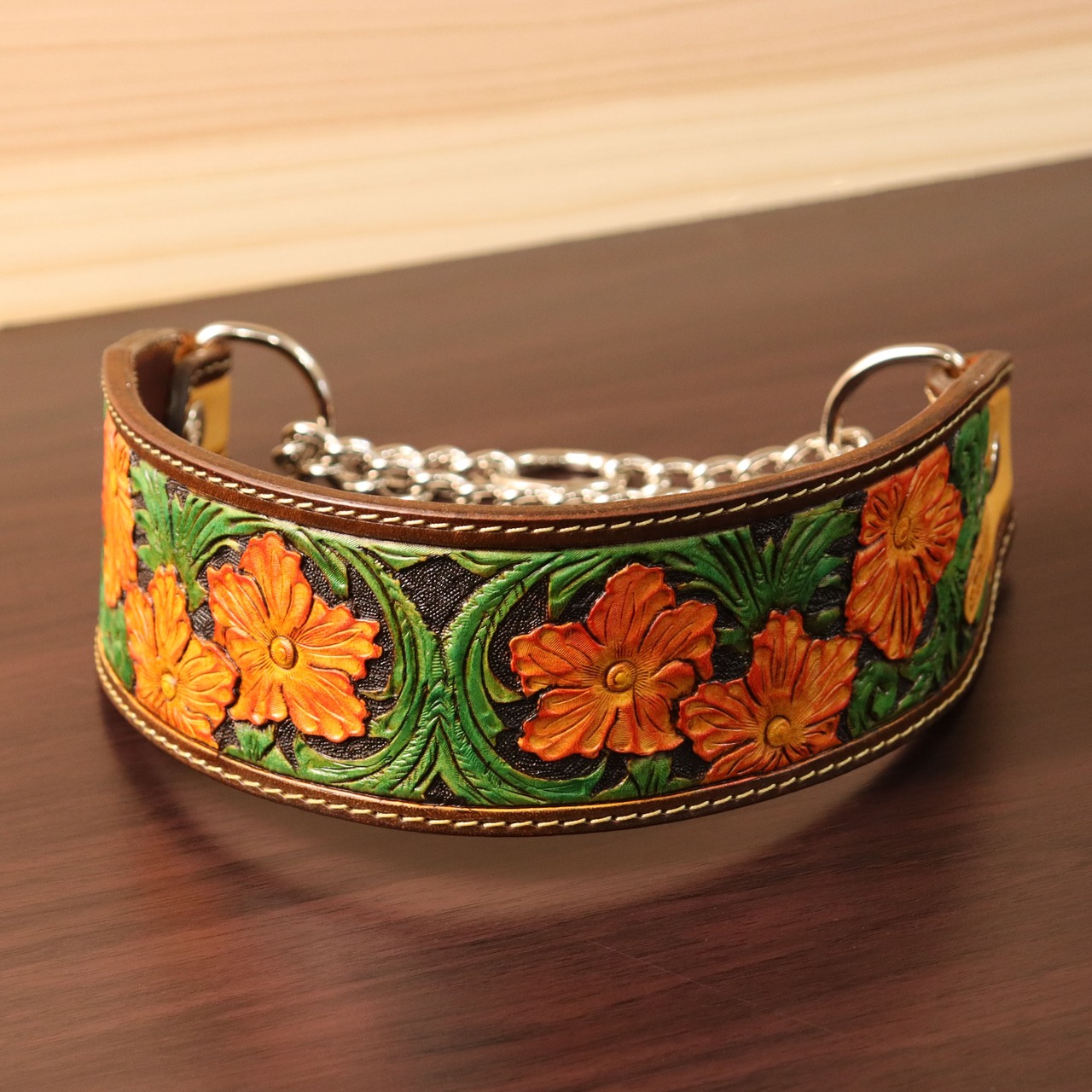 ・伝統的なシェリダンスタイルのレザーカービングに、アンティーク風のカラーリングを施した一点物のデザイン。